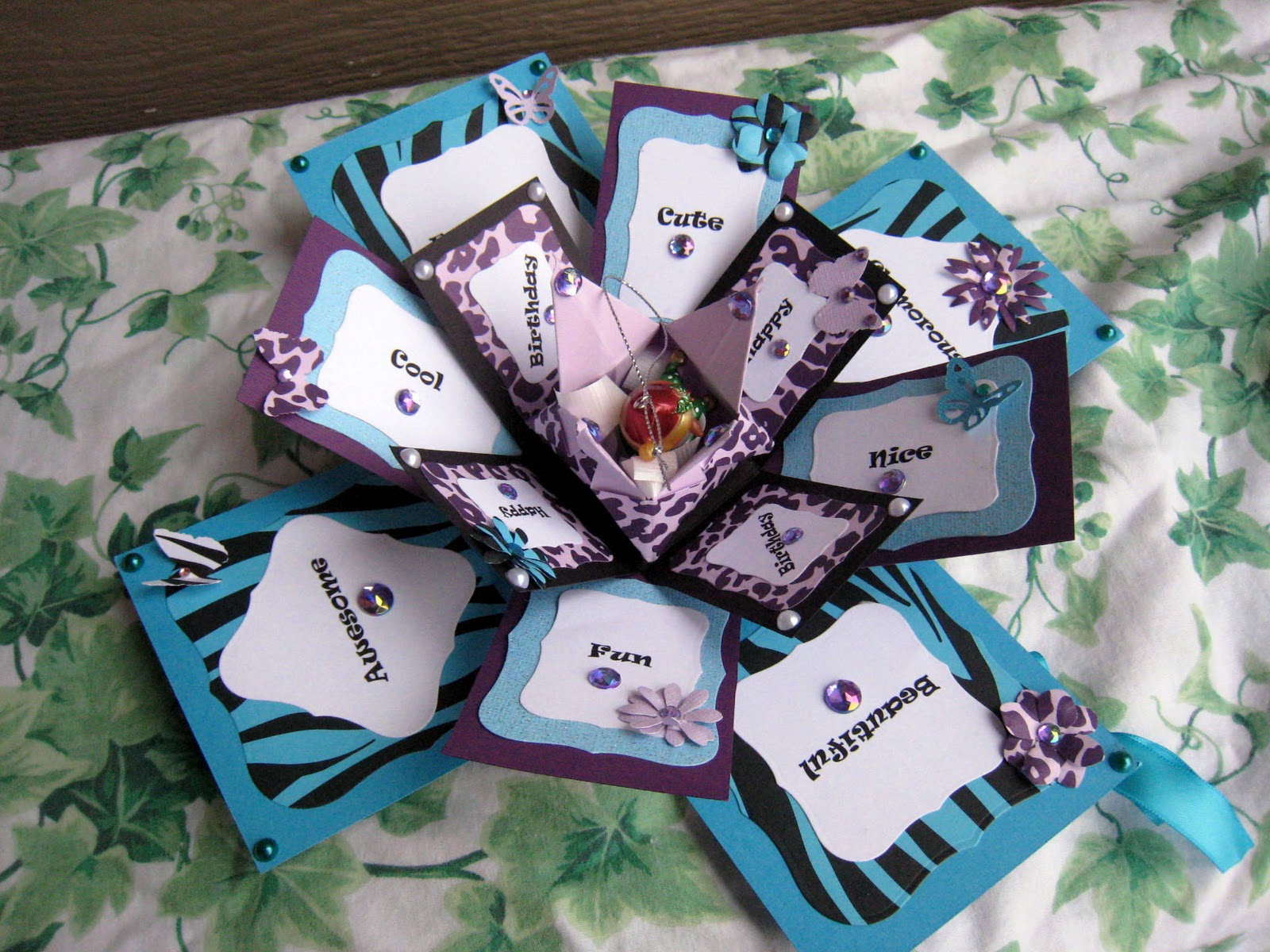 I wish I had gotten a picture of the whole present once everything was wrapped. I used a black and white zebra print wrapping paper on the gift box, along with a turquoise ribbon, then this box card was attached to the top. It really looked cute, if I do say so myself!